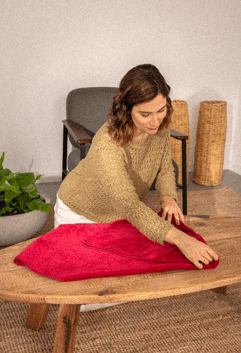 A técnica de rolinhos permite mudar a roupa de um lado para o outro na mala, sem ficar amassada ou enrugada. Gosto de usar especialmente para peças maiores, que ficariam esmagadas em bolsas organizadoras, como toalhas, calças e vestidos fluidos!