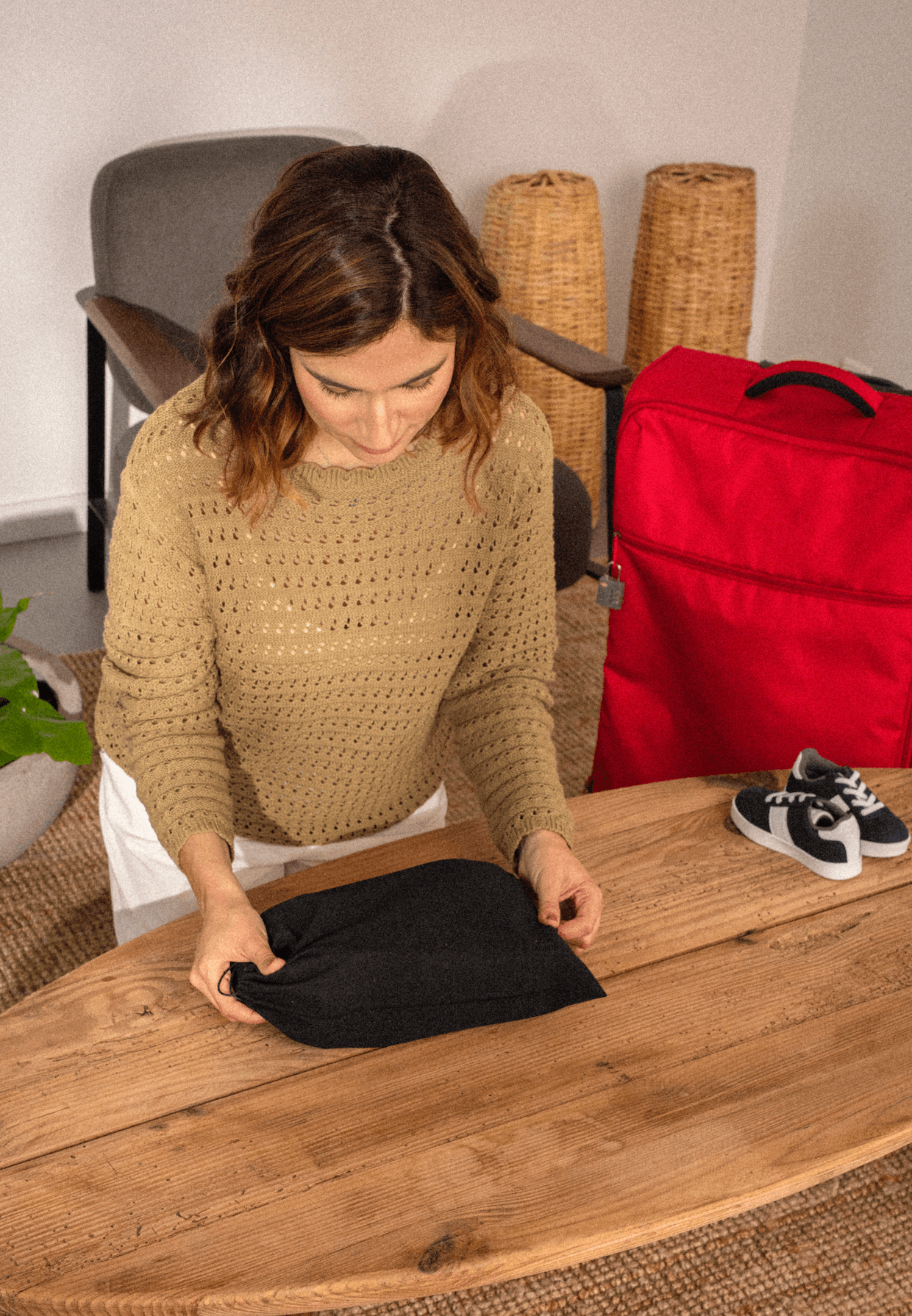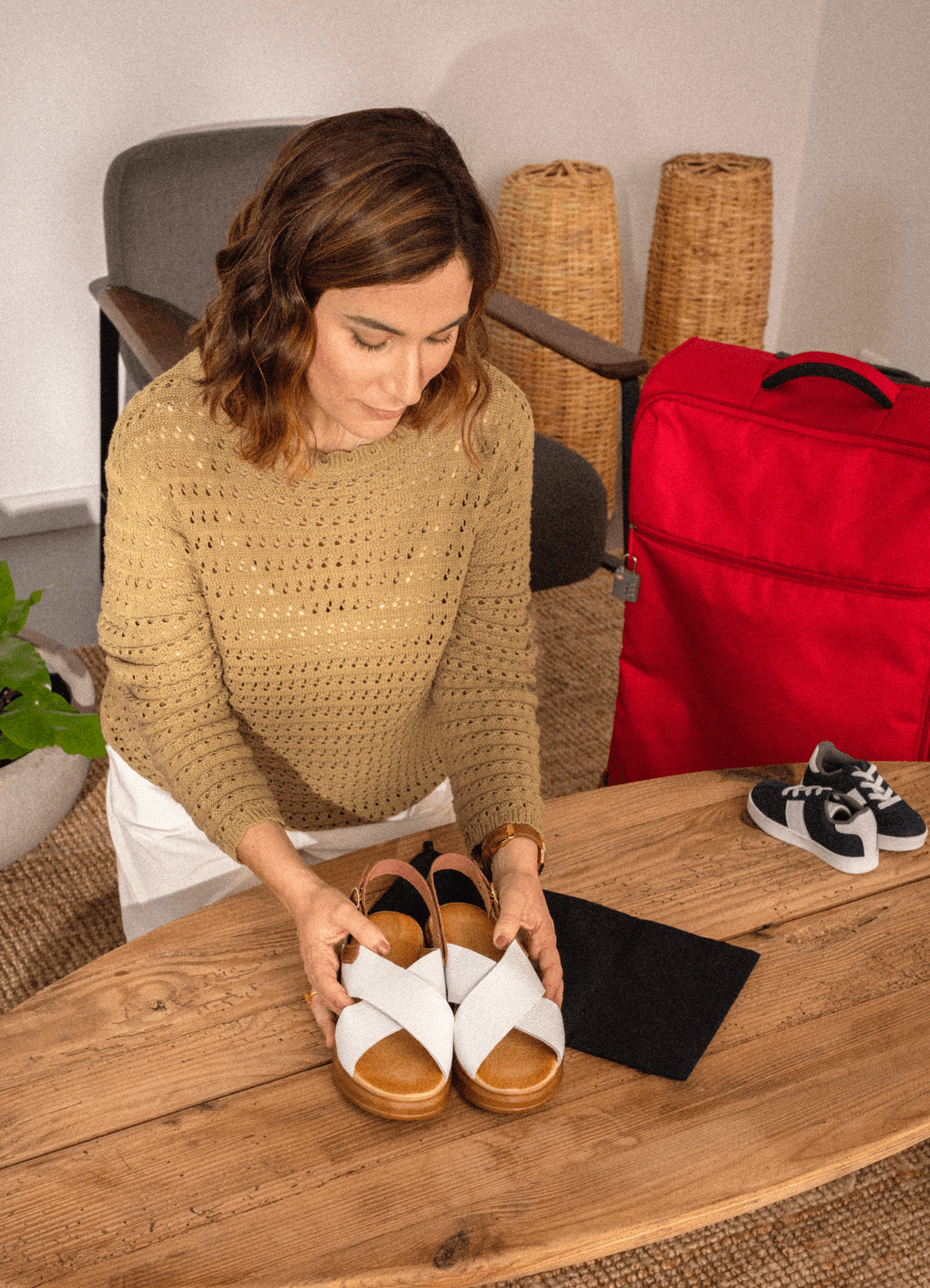 Os sapatos, cuja sola anda no chão, não devem ser misturados com o resto da roupa. Nem que sejam havaianas que usamos na praia… Não é higiénico! Devem estar separados, numa bolsa ou saco de pano próprio para sapatos, ou numa bolsa própria (lateral) que algumas malas têm.