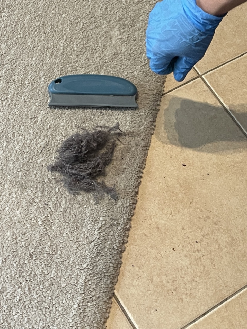 2- Remover pêlo de cão com uma escova especial em silicone (isto foi feito apenas nos tapetes porque a cadela não vai para o sofá)
