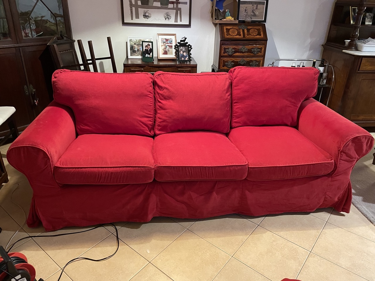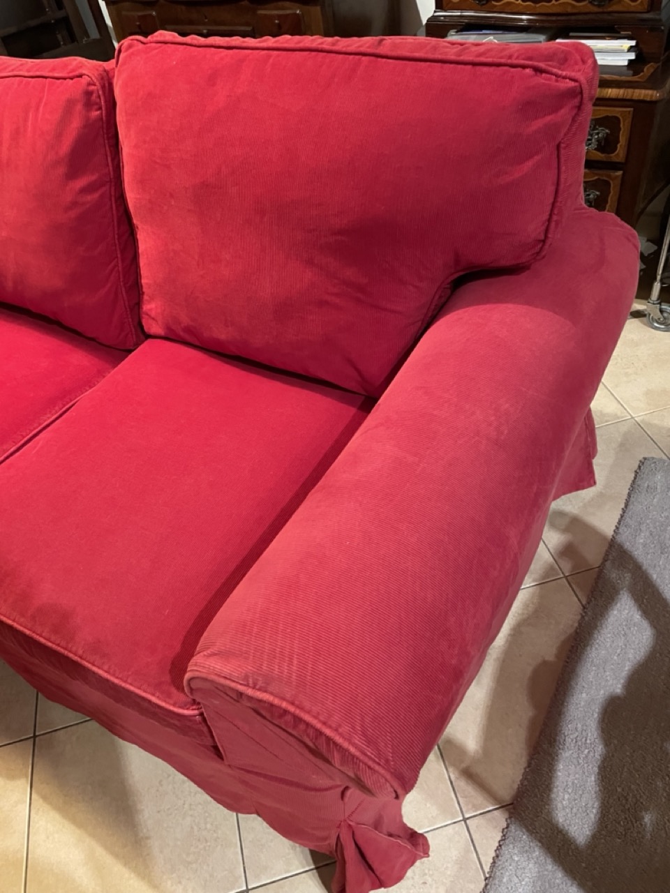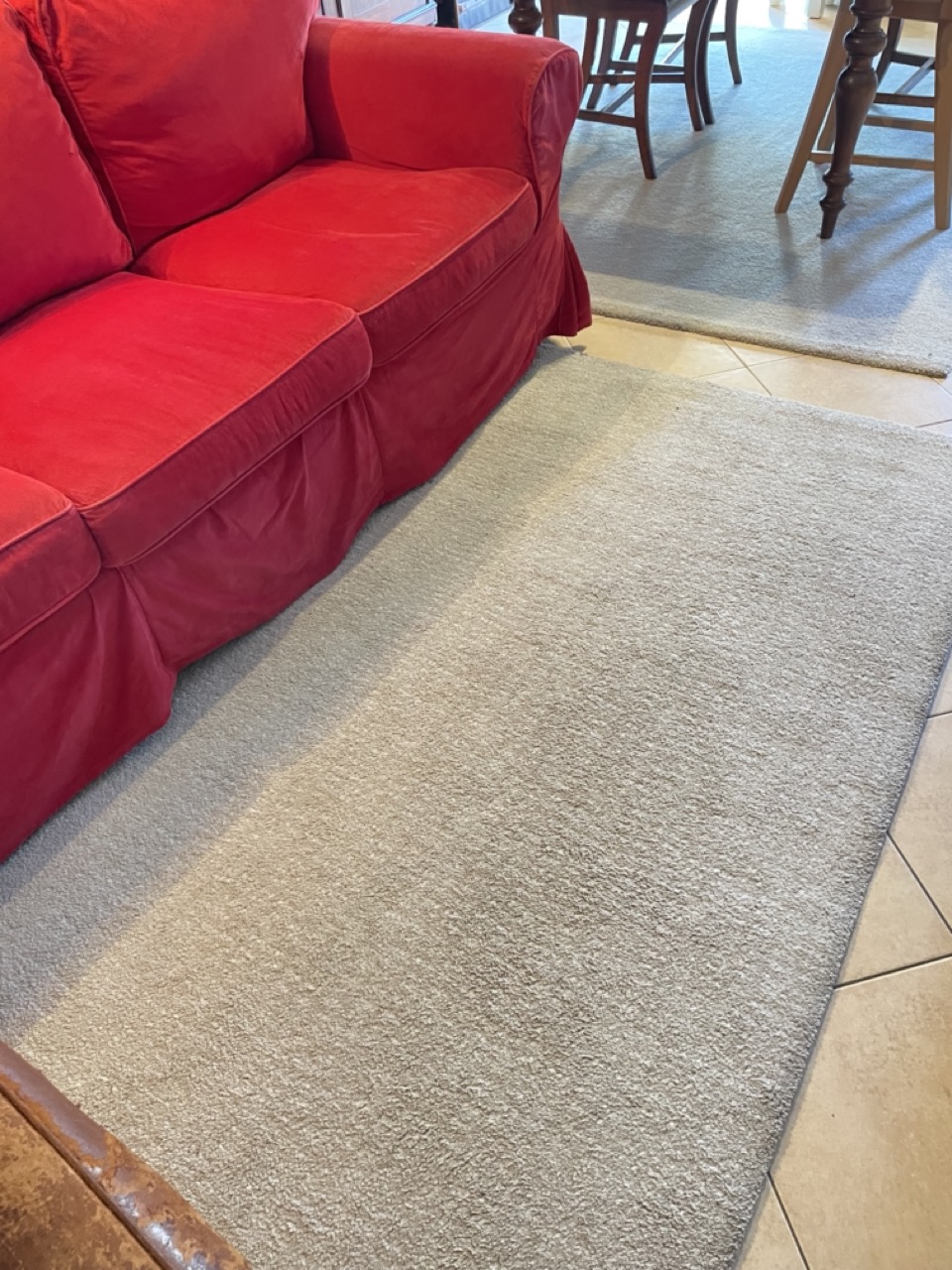 Um sofá da Ikea de 3 lugares, o tapete bege de pelo curto que fica por baixo da mesa de jantar (era o pior) e o tapete que está aos pés do sofá, mesmo modelo do da mesa, mas menor.